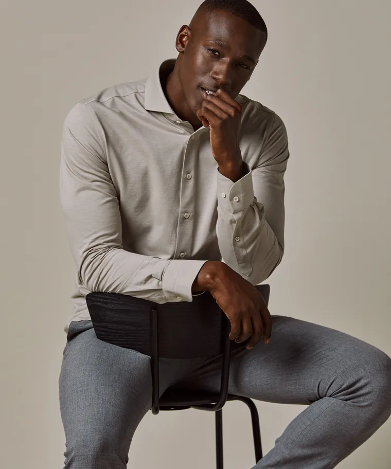 Dit beige Japanese knitted overhemd is gemaakt van een mix van katoen en hightech garen. Het gebreide overhemd combineert de elegantie van een overhemd met het comfort van een t-shirt. Een geweldig overhemd dat zowel formeel als casual gedragen kan worden.